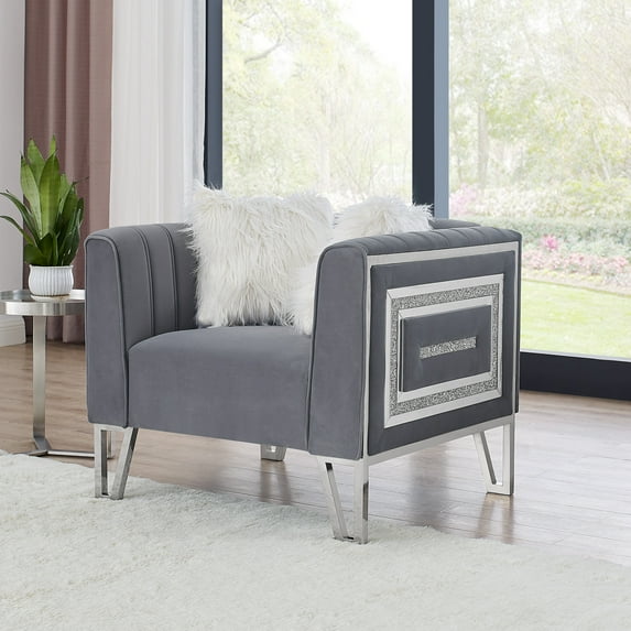Accent Chair, Modern Velvet Tufted Upholstered Armchair with Mirrored Side Trim & Faux Diamonds and Stainless Steel Legs Single Sofa Chair for Living Room, Including Two White Villose Pillows, GreyAccent Chair Modern Velvet Tufted Upholstered Armchair Mirrored Side Trim Faux Diamonds Stainless Steel Legs Single Sofa Chair Living Room IncludingAccent Chair Modern Velvet Tufted Upholstered Armchair Mirrored Side Trim Faux Diamonds Stainless Steel Legs Single Sofa Chair Living Room Including