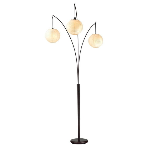 Round rice paper lanterns suspended from curved metal poles. Antique bronze with tan shades. On/off rotary switch on pole. 3 Lanterns, 60 Watts each. 82" Height. Approximate 45" Depth. Shades: 9" Diameter.