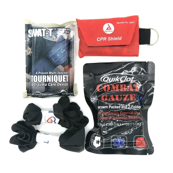 The CLARYMED Advance First Reponder Trauma Kit has everything you needto stop the bleeding for a Traumatic Injury. This Kit comes with:(1) QuikClot Combat Gauze(1) CPR Shield in Soft Case(1) SWAT-T Tourniquet—Black(2) Pairs of Gloves (Medium & Large)