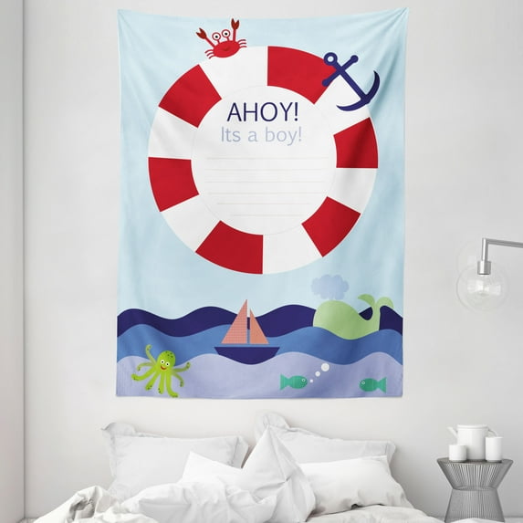 Hero image 0 of Ahoy Its a Boy Tapestry, Announcement Card Inspired Composition Maritime Funny Sea Animals Theme, Wall Hanging for Bedroom Living Room Dorm Decor, 60W X 80L Inches, Multicolor, by Ambesonne, 0 of 2