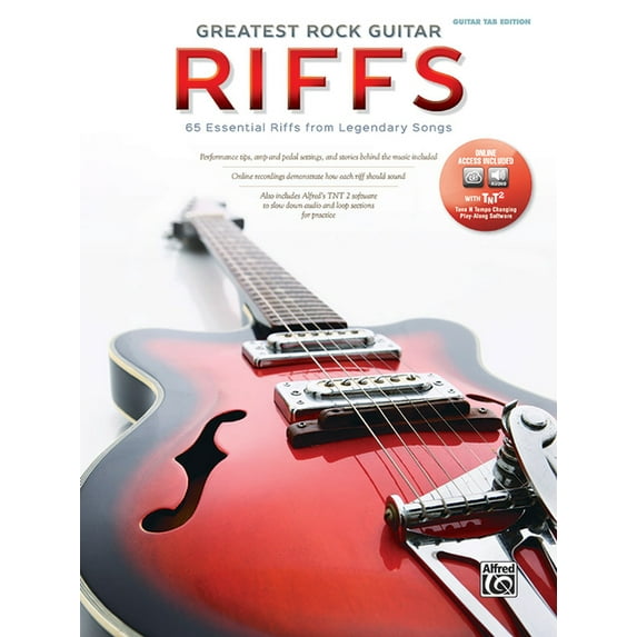You've started learning the guitar---what's the first thing you want to play? A monster riff, of course! Greatest Rock Guitar Riffs provides a solid repertoire of the most recognizable riffs in the pantheon of rock, pop, and acoustic music. The riffs throughout also come with performance tips, settings for your amp and pedals so you can nail the tone, and juicy tidbits on the origins of the music. And the online media includes MP3s that demonstrate what each part should sound like, plus Alfred's TNT 2 software so you can slow down the audio and loop sections for more focused practice. From the twangy swagger of James Bond Theme" and the rockabilly groove of "Shakin' All Over," to the driving chug of Sabbath's "Paranoid," the thunder of Motorhead's "Ace of Spades," and the pentatonic strut of "Play That Funky Music," this book will get you playing recognizable music instantly. Titles: 20th Century Boy (T. Rex) * 25 or 6 to 4 (Chicago) * Ace of Spades (Motorhead) * All Along the Watchtower (The Jimi Hendrix Experience) * Babe I'm Gonna Leave You (Led Zeppelin) * Back in Black (AC/DC) * Bad to the Bone (George Thorogood and the Destroyers) * Bawitdaba (Kid Rock) * Beginnings (Chicago) * Big Yellow Taxi (Joni Mitchell) * Black Dog (Led Zeppelin) * Bron-Yr-Aur (Led Zeppelin) * Brown Sugar (The Rolling Stones) * Can't You Hear Me Knocking (The Rolling Stones) * The Chain (Fleetwood Mac) * Chuck E's in Love (Rickie Lee Jones) * Classical Gas (Mason Williams) * Closer to the Heart (Rush) * Copperline (James Taylor) * Dirty Water (The Standells) * Do You Feel Like We Do (Peter Frampton) * Don't Stop Believin' (Journey) * Everybody Wants You (Billy Squier) * Falling Slowly (Glen Hansard and Marketa Irglova) * Far Cry (Rush) * Friday on My Mind (The Easybeats) * From Me to You (The Beatles) * Hold the Line (Toto) * Hold Your Head Up (Argent) * If It Makes You Happy (Sheryl Crow) * If You Talk Too Much (My Head Will Explode) (People in Planes) * James Bond Theme (John Barry Orchestra) * Jumpin' Jack Flash (The Rolling Stones) * Kashmir (Led Zeppelin) * Last Resort (Papa Roach) * Limelight (Rush) * Live and Let Die (Paul McCartney and Wings) * Lola (The Kinks) * Moby Dick (Led Zeppelin) * Money (Pink Floyd) * One Thing (Finger Eleven) * Over the Hills and Far Away (Led Zeppelin) * Paint It, Black (The Rolling Stones) * Paralyzer (Finger Eleven) * Paranoid (Black Sabbath) * Pick Up the Pieces (Average White Band) * Pinball Wizard (The Who) * Play That Funky Music (Wild Cherry) * Ramble On (Led Zeppelin) * (I Can't Get No) Satisfaction (The Rolling Stones) * The Seeker (The Who) * Shakin' All Over (Johnny Kidd and the Pirates) * She Loves You (The Beatles) * Short Skirt / Long Jacket (Cake) * Spirit in the Sky (Norman Greenbaum) * The Spirit of Radio (Rush) * Stairway to Heaven (Led Zeppelin) * The Story in Your Eyes (The Moody Blues) * The Wanton Song (Led Zeppelin) * Watch Your Step (Bobby Parker) * What If (Creed) * Whole Lotta Love (Led Zeppelin) * Wipe Out (The Surfaris) * With Arms Wide Open (Creed) * You Can't Always Get What You Want (The Rolling Stones)."