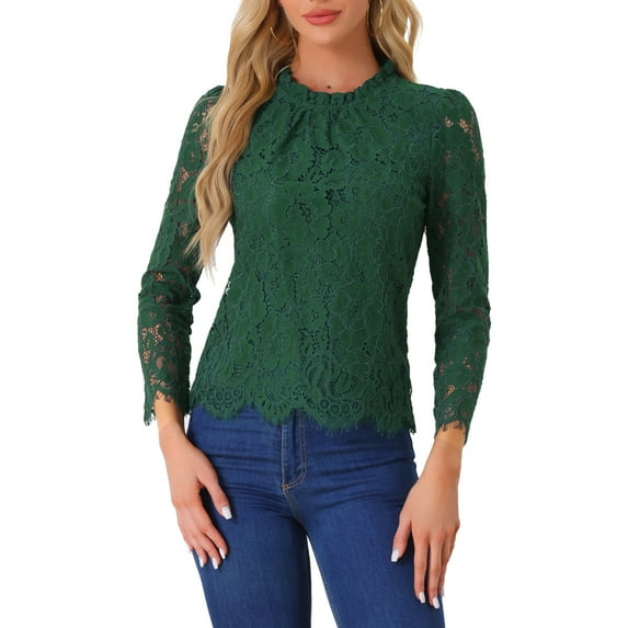 Hero image 0 of INSPIRE CHIC Women's Lace Top Long Sleeve Ruffled Neck Peplum Hem Floral Dressy Blouse XL Dark Green, 0 of 6