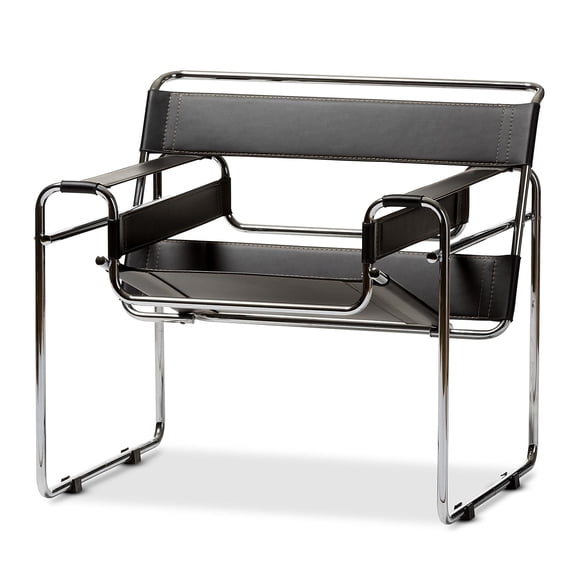 Constructed with sturdy steel frame, full bonded leather seat, back, and sides that are connected with the chromed steel frame; this chair will pique your interest with its unusual design and look.