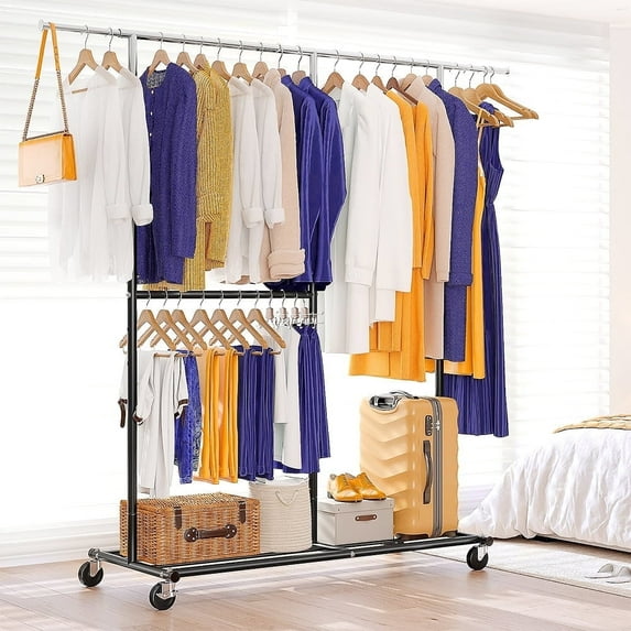 15 out of 5 Stars. 1 reviewsShipping, arrives in 3+ daysFlngr Double Rods Clothes Rack,Heavy Duty Clothes Rack with Wheels,Hanging Clothes Portable Wardrobe Rack for Bedroom Laundry Living Room, Black $39.99 Was $69.99