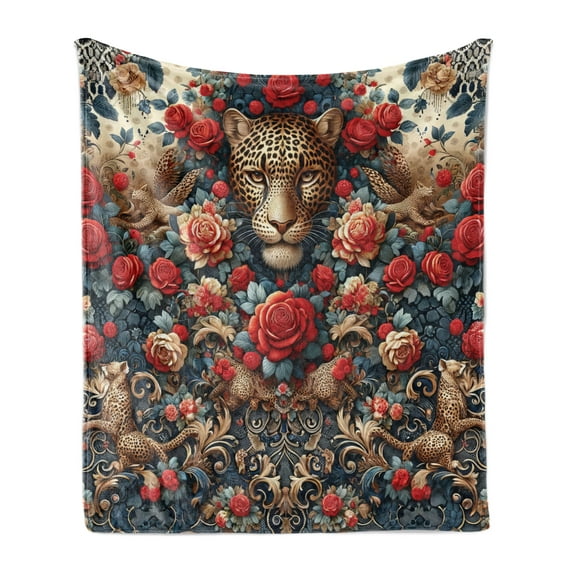 Hero image 0 of Ambesonne Leopard Fleece Throw Blanket Rich Rococo Style Roses 50"x60" Dark Coral Caramel and Blue, 0 of 5