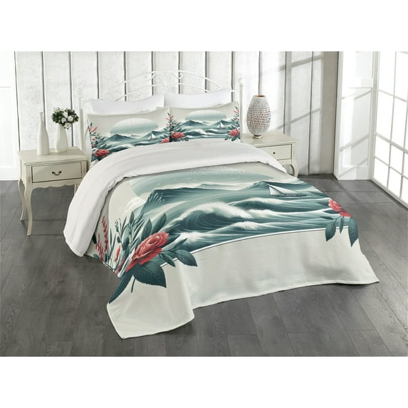 Hero image 0 of Ambesonne Nautical Quilted Coverlet 3 Pcs, Wild Roses and Sailboat, Queen Size, Coral and Slate Blue, 0 of 4