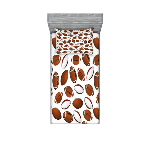 Hero image 0 of American Football Fitted Sheet & Pillow Sham Set, Classic Design Rugby Balls in Cartoon Style Sports Competition, Decorative Printed 4 Piece Bedding Decor Set, Twinxl, Caramel Ruby White, by Ambesonne, 0 of 3