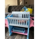 - Comprehensive Set: Includes crib, storage shelf, cupboard, feeding chair, sink, fork, spoon, plate, sippy cup, and baby powder dispenser.