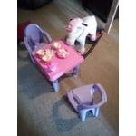 - Complete with a pink and purple table and 2 chairs