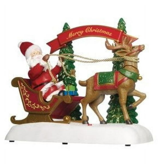 A jolly and whimsical musical holiday diorama that moves, lights up and plays a myriad of Christmas carols all while the lights twinkle and the reindeer moves his head up and down from the gentle golden reigns of Santa Claus!