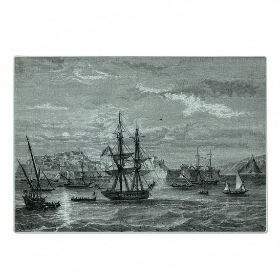Hero image 0 of Antique Cutting Board, Departing from Elba Vintage Engraved Illustration History of France Sails Vessels, Decorative Tempered Glass Cutting and Serving Board, Small Size, Black Grey, by Ambesonne, 0 of 1