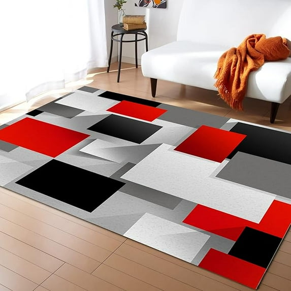 Area Rug, White Grey Black Red Modern Abstract Art Geometric Area Rug, Living Room Rugs, Area Rugs For Bedroom Decor Living Room Decor, Carpet Bedroom Rug, Rugs For Living Room 4 x 5ft