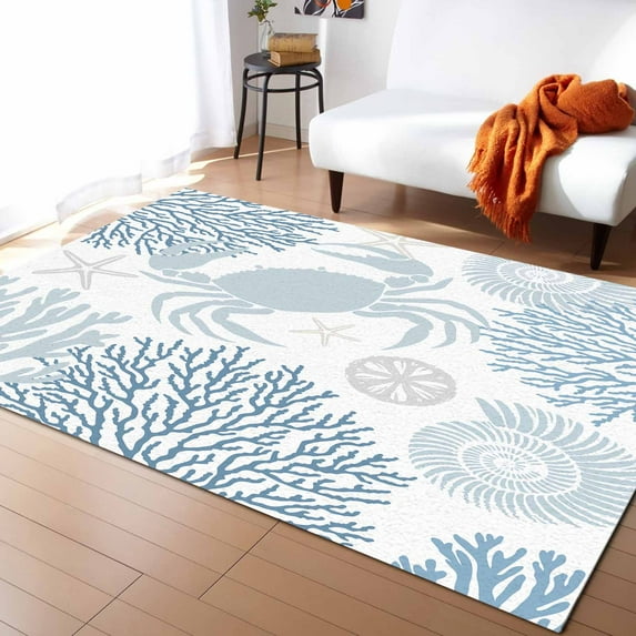 Hero image 0 of Area Rugs Indoor Non-Slip Rectangle Rug 5x8 Ft Summer Blue Grey Crab Coral Seashell Nautical Coastal Rug Rubber Backing Floor Mats Non Shedding Home Decor Carpet for Entryway Living Room, 0 of 8