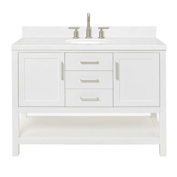 45 out of 5 Stars. 4 reviewsShipping, arrives in 3+ daysARIEL Hepburn 36 Inch White Bathroom Vanity with Single Sink, Solid Wood Vanity Base Cabinet, Carrara White Quartz Countertop, 1.5-Inch Edge, Right Rectangular Sink, 2 Soft Closing Doors, 5 Drawers $1,050.00