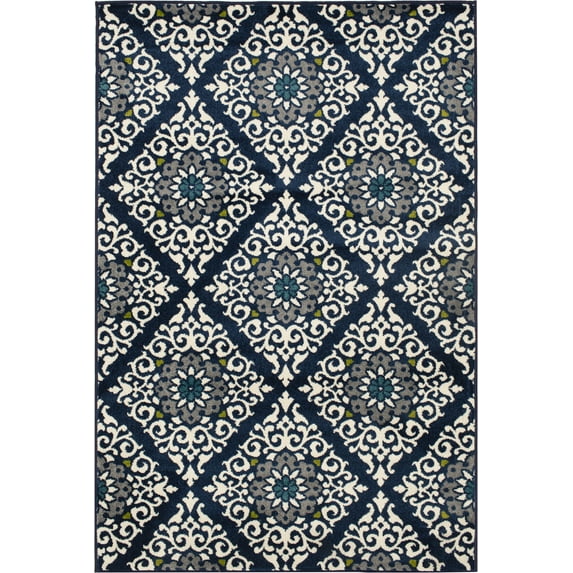 Ornate design in perfect symmetry makes an eye-catching and elegant addition to any dining room, den, or living room. If you’re looking for a sophisticated yet fun piece to complete the look of your space, this beautifully woven area rug is exactly what you need. Intricate diamond medallions in ivory and charcoal are accented by pops of bright teal and lime green, all across a dynamic cobalt blue background. Each rug is machine made in state-of-the-art, computer-driven looms, and the low profile pile of super-soft Polypropylene yarn allows you to enjoy high-end design without sacrificing comfort or durability. Perfect for a wide range of decor styles, this beautifully woven area rug will do well in any area of your home - even places with high traffic and spill risk. In addition to being easy to clean, the stain resistant and fade resistant properties of this piece ensure that it will maintain its appearance for years to come. For indoor.