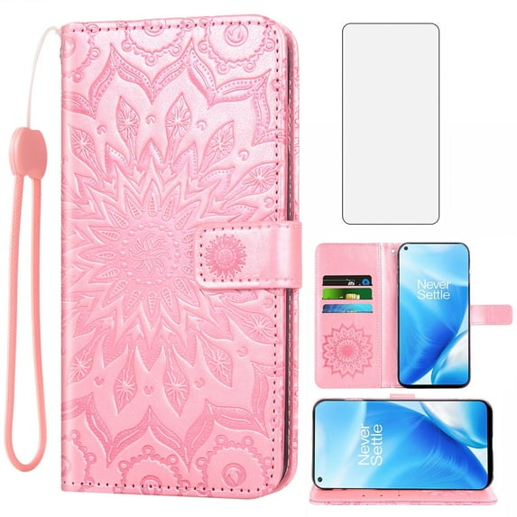 Hero image 0 of Compatible with OnePlus Nord N200 5G Wallet Phone Case and Tempered Glass Screen Protector Flip Credit Card Holder Stand Mandala Flower Cell Cover for On1 Plus One+ 1+ N2005G 2021 Women Men Pink, 0 of 9