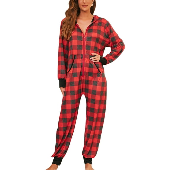Hero image 0 of Avamo Women Long Sleeve Zipper Front Hooded Jumpsuit Sleepwear Onesie Pajamas Set With Pocket Ladies Loose Plaid Romper Playsuit, 0 of 6