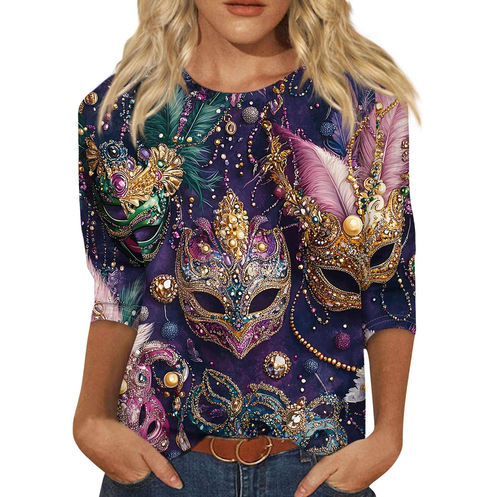 Hero image 0 of BDPORKAS Mardi Gras T Shirts for Women 3/4 Sleeve Round Neck Carnival Costume Mask Print Funny Gifts Parade Tshirt Plus Size Mardi Gras Outfit, 0 of 5