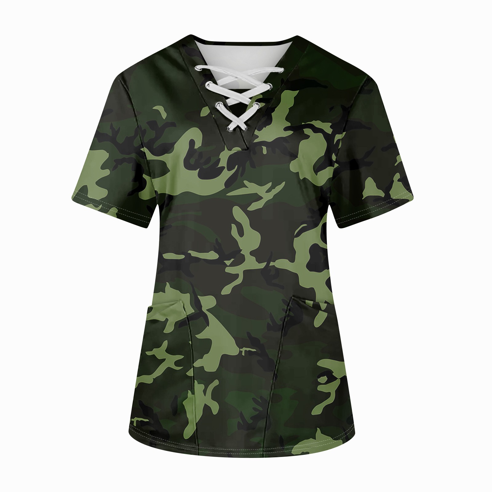 BDPORKAS Womens Scrub Tops Cool Breathable Fabric Nurse Working Uniform Cross V Neck Graphic Camo Print Short Sleeve Nurse Shirt Tops Workwear with Pockets