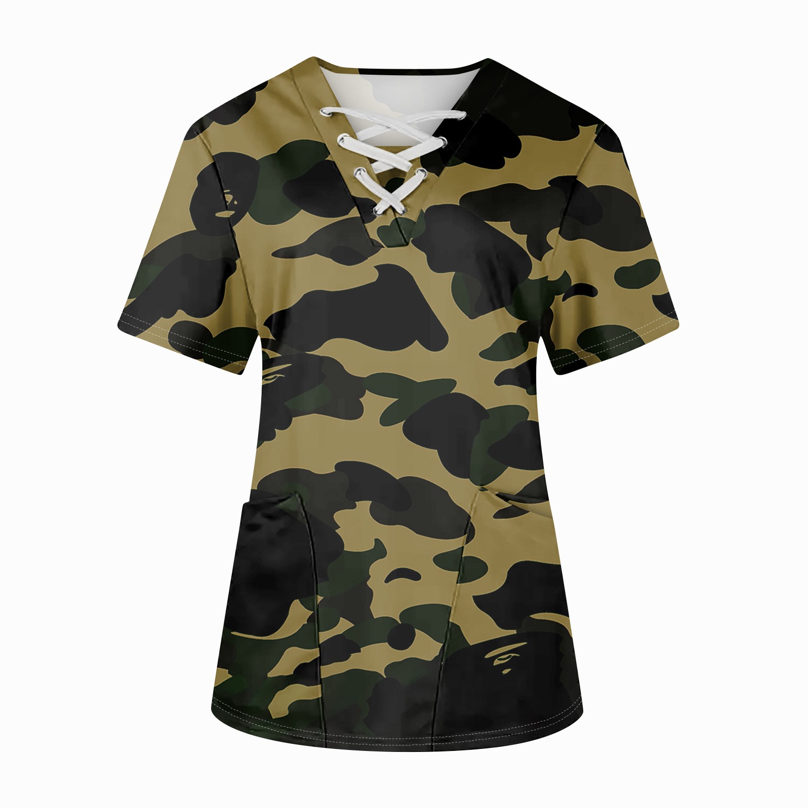 BDPORKAS Womens Scrub Tops Cool Breathable Fabric Nurse Working Uniform Cross V Neck Graphic Camo Print Short Sleeve Nurse Shirt Tops Workwear with Pockets