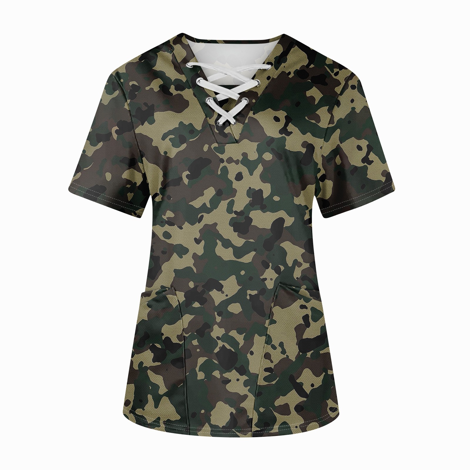 BDPORKAS Womens Scrub Tops Cool Breathable Fabric Nurse Working Uniform Cross V Neck Graphic Camo Print Short Sleeve Nurse Shirt Tops Workwear with Pockets