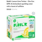 $3567current price $35.67BUBBL'R lemon lime twist'r, Antioxidant Sparkling Water with Natural Caffeine, 0g Sugar, Gluten Free, All Natural Flavors, 12 Fl Oz Cans, 12 Count