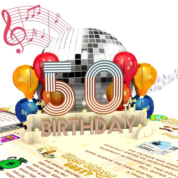 - Inside of card: 3D pop-up disco ball with a light show, pop-up balloons, ""50th BIRTHDAY"" text, and a groovy disco-themed birthday song, plus fun 1975 facts and trivia