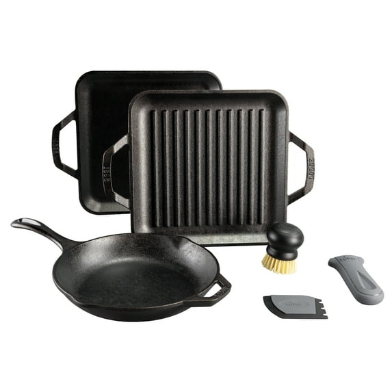 - Comprehensive Set: Includes a 10-inch Chef Collection Skillet, Square Griddle, Grill Pan, Deluxe Handle Holder, Deluxe Scraper, and Round Scrub Brush.