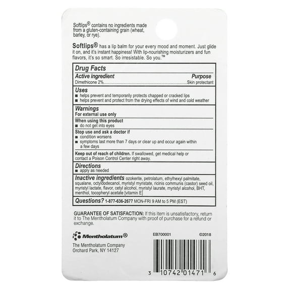 YOU Want Softlips? We Are Softlips. Pamper your lips with soothing Softlips lip protectant. This 3-pack of lip balms is designed to provide intense lip hydration, leaving lips feeling soft and smooth. The lip-smacking flavors add a touch of sweetness to your daily lip care routine and the dermatologist-tested formula ensures that you can trust the quality and safety of Softlips lip protectant. This 3-pack of Watermelon, Cherry and Vanilla Softlips chap sticks are cruelty-free, paraben-free, phthalate-free and gluten-free*. The compact and portable design allows you to take Softlips Lip Protectant wherever you go – slip it in your pocket or purse for on-the-go lip hydration, ensuring your lips stay moisturized and protected throughout the day. Experience the perfect blend of hydration and delicious flavors with Softlips Lip Protectants. Try all Softlips products: Softlips Classics come in a variety of fun flavors, Softlips Naturals use 100% natural ingredients, and Softlips Seasonals make fun and thoughtful gift-giving. *Softlips contains no ingredients made from gluten-containing grain (wheat, barley, or rye). Made in the USA with global ingredients. Use as directed.