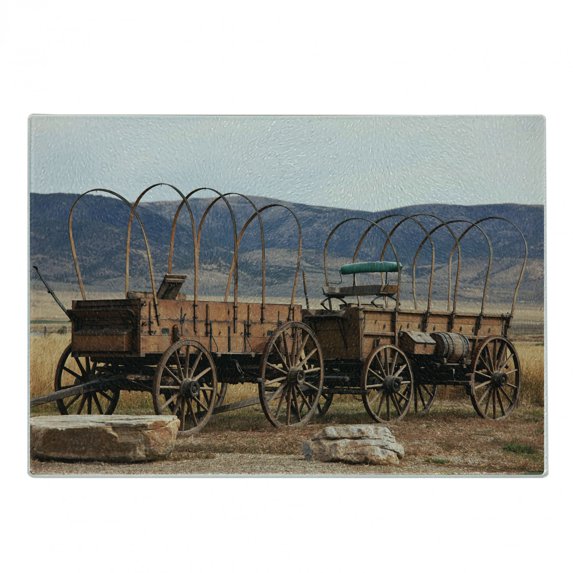 Hero image 0 of Barn Wood Wagon Wheel Cutting Board, Vintage American Carriages Western Historical Transportation Prairie, Decorative Tempered Glass Cutting and Serving Board, Small Size, Brown White, by Ambesonne, 0 of 1