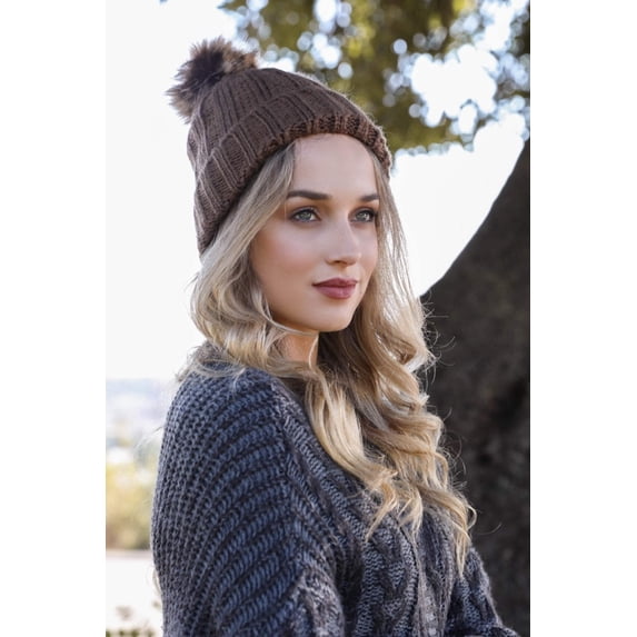 A ribbed knit beanie with a faux fur pom for a stylish addition to any outfit. Thermal Lining "When the temperatures drop, stay warm and look cool with this ribbed knit beanie. The faux fur pom adds a touch of style, while the thermal lining ensures maximum warmth. Adventure awaits!"