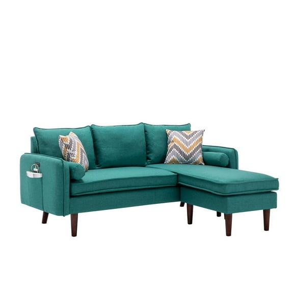 Ranon 70 Inch Sectional Chaise Sofa, Pillows, USB Ports, Side Pockets, Teal - Saltoro Sherpi This tastefully modern sectional chaise sofa from the Ranon colleciton will make your leisure hours that much cozier. With quality solid wood, it has foam stuffed seats and a padded backrest, all upholstered in teal green linen fabric. It also features four accent pillows, two USB ports, a convenient side pocket, and a reversible chaise. Check out our Ronan collection for matching pieces.