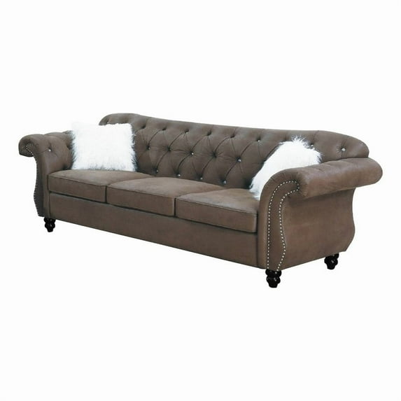 Effortlessly upgrade any contemporary or traditional living space with this artisanally crafted modern brown sofa. With a sturdy, high-quality solid wood frame, seat cushions filled with plush, high-density foam, beautifully rolled arms, a button-tufted back, and silver nailhead trim, this piece sings with style and sophistication. Check out our Rima collection for matching items.