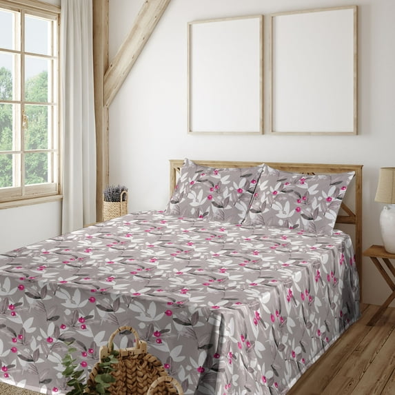 Hero image 0 of Ambesonne Berry Pattern Fitted & Flat Sheet with Shams 4 Pcs Set, Modern Leafy Pattern, Calking, Taupe Grey Hot Pink Ivory, 0 of 5