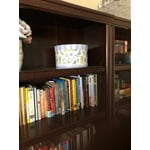 - Spacious shelves hold books, binders, framed photos, collectibles, and more