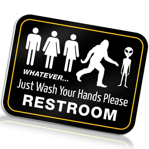 Hero image 0 of Bigtime Signs Funny Bathroom Sign for Restroom 11.5" x 8.75" Rigid PVC | All Gender Bigfoot & Alien Wash Your Hands Please, 0 of 9