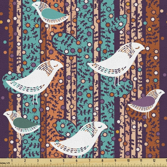 Hero image 0 of Birds Upholstery Fabric by the Yard, Funny Winged Animals Pattern on Vertical Striped Geometric Branches, Decorative Fabric for DIY and Home Accents, Plum Turquoise and Salmon by Ambesonne, 0 of 5