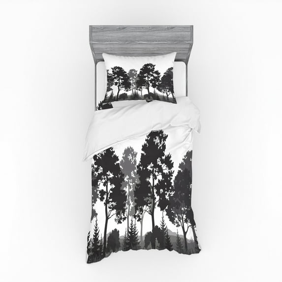 Black and White Duvet Cover Set, Summer Forest with Pine and Fir Trees Grass Bush Silhouettes, Bedding Set with Shams and Fitted Sheet, 3 Sizes, by AmbesonneBlack White Duvet Cover Set Summer Forest Pine Fir Trees Grass Bush Silhouettes Bedding Set Shams Fitted Sheet 3 Sizes AmbesonneAmbesonne Black and White Bedding Set 3 Pcs Summer Forest Twin Grey White Charcoal GreyAmbesonne Black and White Bedding Set 4 Pcs Summer Forest Queen Grey White Charcoal Grey