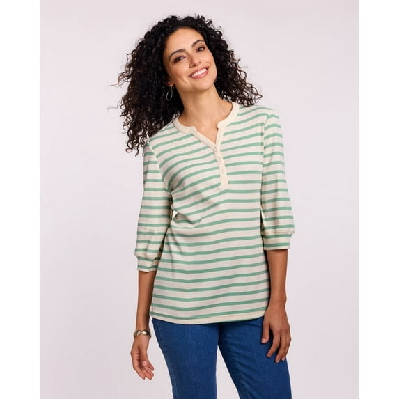 Our comfortable Ribbed Henley Top features a contrast colored collar, Y-shaped placket and button placket. It also has three-quarter length sleeves with a slightly puff sleeve with slight shirring at cap and shirring above 2" wide self-cuff, and a straight bottom hemline.