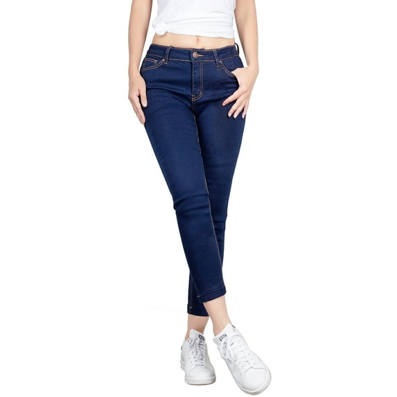 Hero image 0 of BodiLover, Women's, Ripped Ankle Length Mid Rise 5 Pockets Comfy Skinny Cropped Jeans, Denim Blue, 1, 0 of 4
