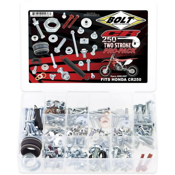 Model specific Pro-Packs contain Factory style hardware in factory style & finish including:. Shroud bolts, seat bolts, sub-frame bolts, fork guard bolts, rotor bolts, a full set of sprocket bolts, t-nuts, factory style aluminum bushing for the bodywork, rim lock spacers, replacement valve stem grommets & caps, Fuji lock nuts, factory style bolts, and drain plug washers. The KX/KXF kit additionally includes a metal locking axle nut to eliminate stock castle nut/cotter-pin and factory style bolts have captured washers.