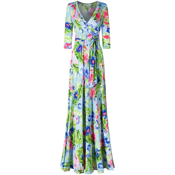 - FEATURES: This maxi dress features elegant quarter sleeve, deep V neck line, floor length, a waist tie creating an elegant and flattering wrap around the body, also great for maternity. Available in multiple eye-catching patterns including palm tree, vivid flowers, and Geo patterns.