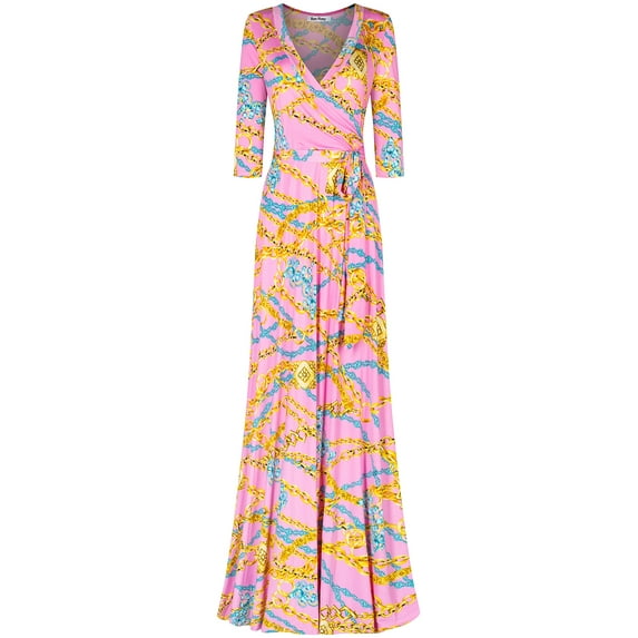 Bon Rosy, Women's, 3/4 Sleeve V-Neck Printed Maxi Faux Wrap Dress, Pink, MBon Rosy Women s 3 4 Sleeve V Neck Printed Maxi Faux Wrap Dress Pink M