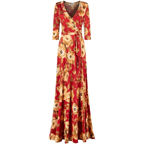 - FEATURES: This maxi dress features elegant quarter sleeve, deep V neck line, floor length, a waist tie creating an elegant and flattering wrap around the body, also great for maternity. Available in multiple eye-catching patterns including palm tree, vivid flowers, and Geo patterns.