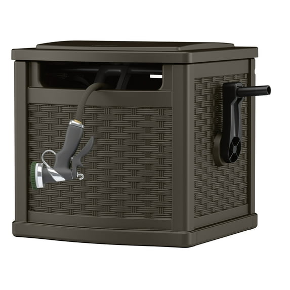 - Concealed Design: Attractive resin wicker exterior in Java Brown fully conceals the hose and reel for a tidy appearance.