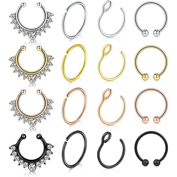 - Package: 16PCS- 4pcs fake septum jewelry with CZ, 12pcs fake nose ring hoop in different 3 styles, total 4 styles fake nose rings, each style comes with silver/rose gold/black/gold colors