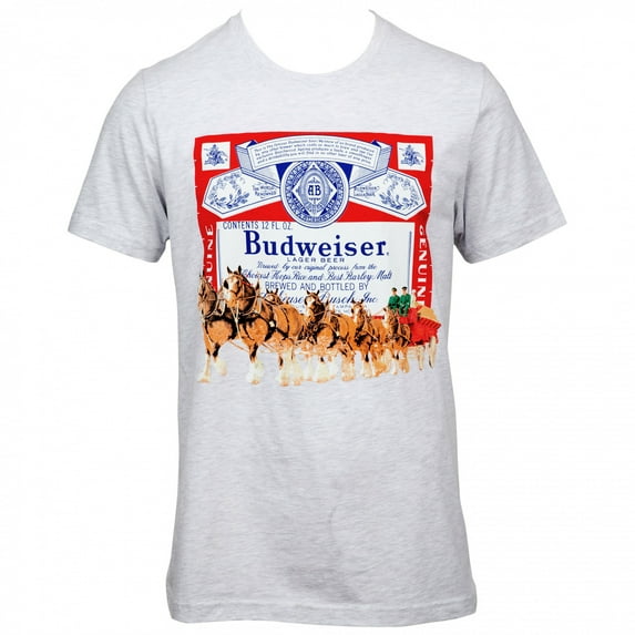 Officially licensed Budweiser Clydesdale Logo T-Shirt. Made from a cotton/poly blend and features the Budweiser Beer label and famous Budweiser Clydesdales on the front of a grey t-shirt.