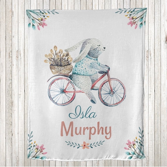 Hero image 0 of Bunny Throw Blanket, Happy Hopping Rabbit Riding a Bike Watercolor Pastel Colors Floral, Flannel Fleece Accent with Custom Name Photo Backdrop, 60" x 50", Coral Deep Sky Blue and White, by Ambesonne, 0 of 4