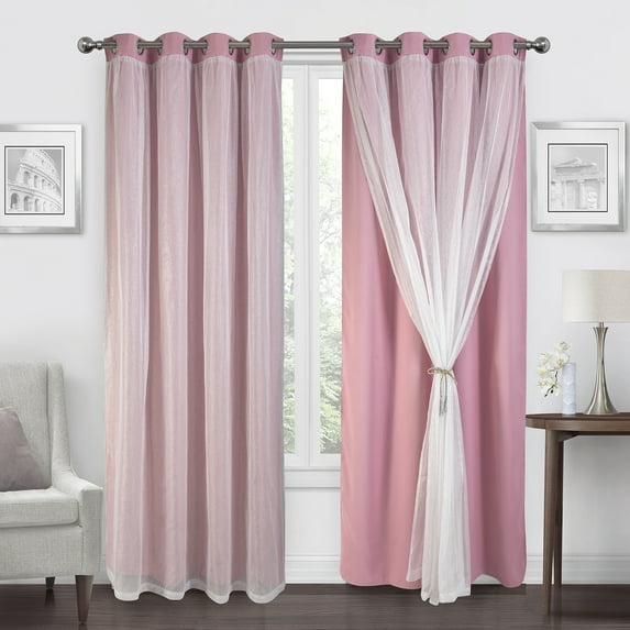 CJC Pink Blackout Curtains with Sheer Voile Overlay, Grommet Top Thermal Insulated Curtains, 2 Panels, 52"x84"