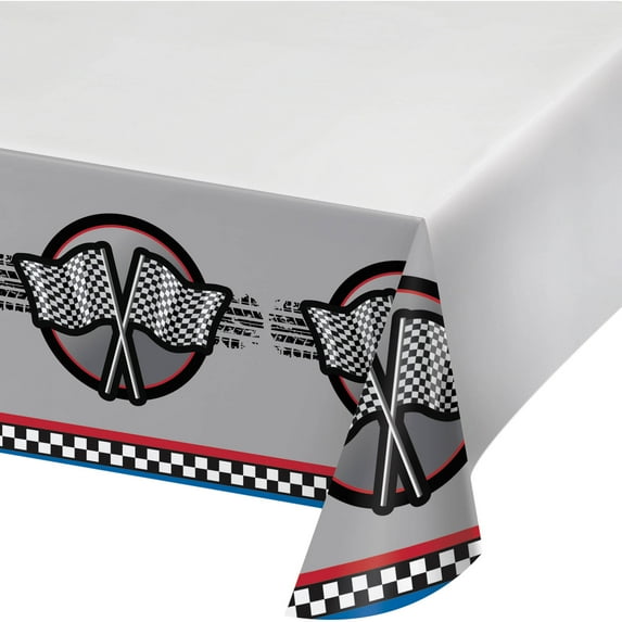 Add our Racing Time Plastic Tablecover to any race car themed birthday party! Plastic tablecover features a solid white center with race flags and black and white checkered bordering the sides of the tablecover. Measures 54" x 102". Includes 1 plastic tablecover per package.